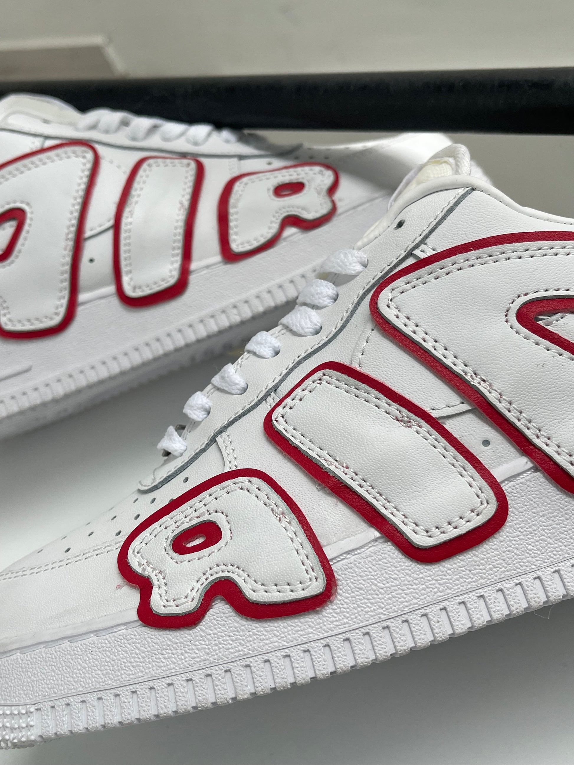 Este modelo llega en cuero blanco premium con detalles en rojo vibrante que resaltan el lettering lateral “AIR” y la estructura del par. Su suela gruesa, costuras precisas y plantilla acolchada garantizan comodidad y presencia en cada paso.